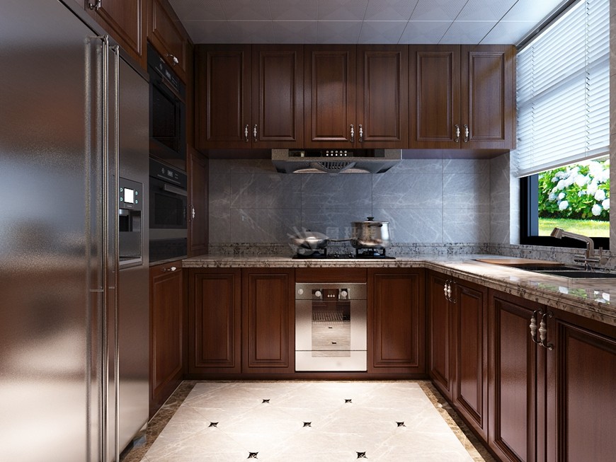 紅棕色整體(tǐ)櫥櫃與案台、牆、地面的卡其配色