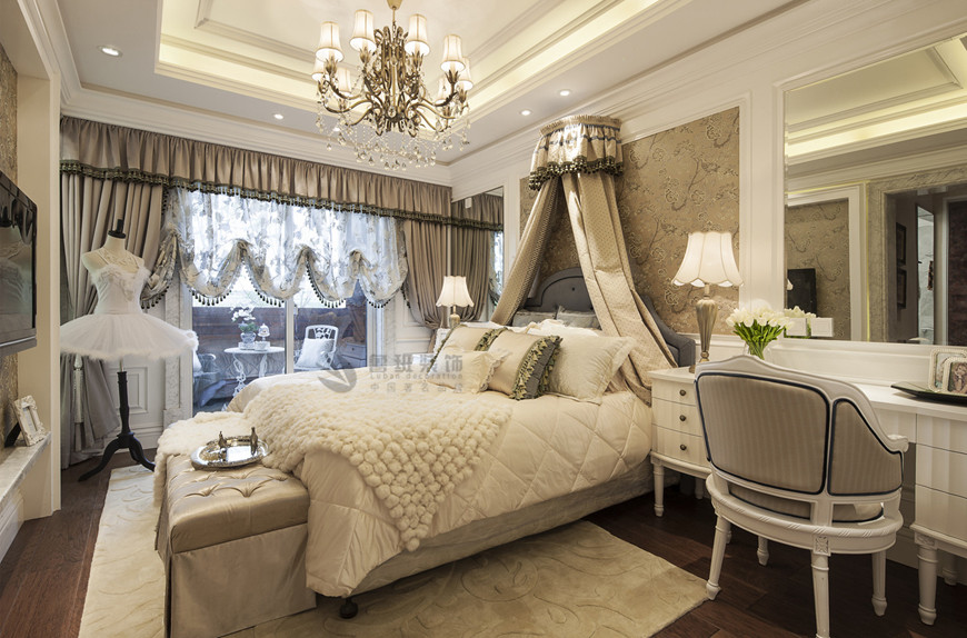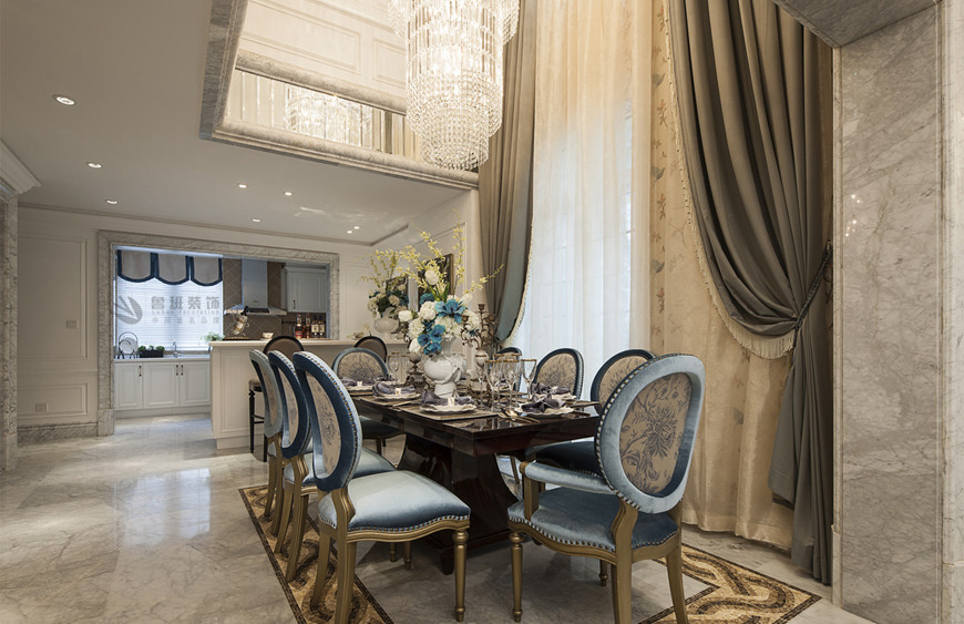 【設計說明】法式的優雅是任何裝(zhuāng)修風格都無法比拟的,崇尚浪漫優雅就必選法式。法式風格在細節的雕琢上下功夫,注重雕花(huā)、線(xiàn)條,制作(zuò)工(gōng)藝精(jīng)細考究。在布局上突出軸線(xiàn)的對稱,恢宏的氣勢,高貴典雅。主打色系儒雅灰,經典的湖(hú)藍色搭配,絲絨的家具(jù)柔軟舒适,每一點都是十分(fēn)耐看。設計内融入生活的喜好,每一處都會住的舒心優雅,比如愛跳舞的女兒便住在公(gōng)主房内。